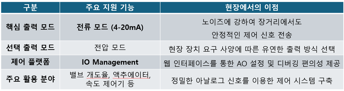 Edge Computing Gateway´Â 4-20mA ¾Æ³¯·Î±× Ãâ·Â(AO) ±â´Éµµ Áö¿øÇÕ´Ï´Ù.