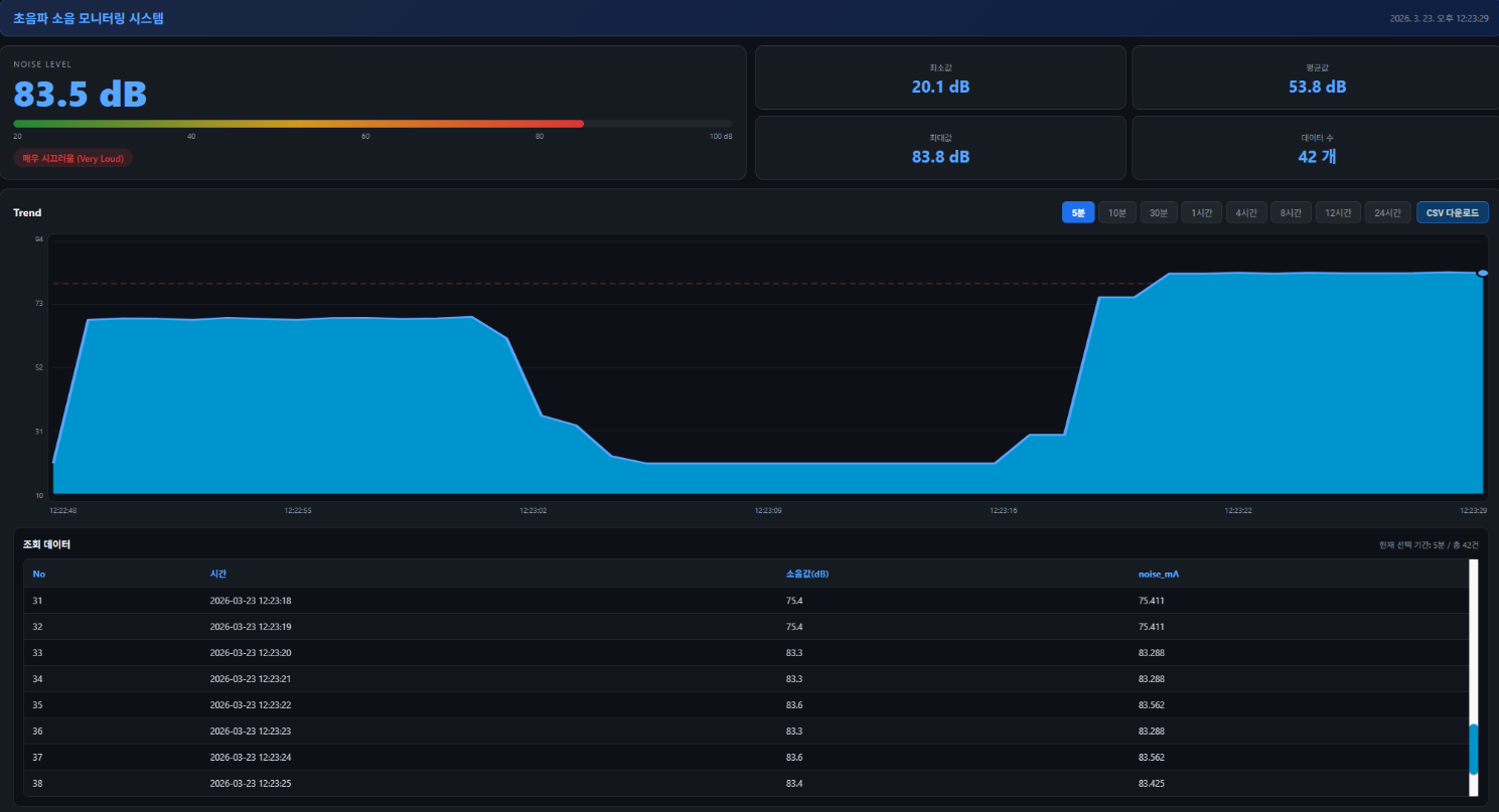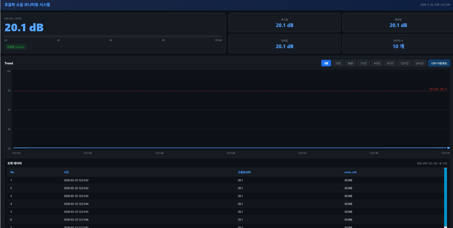 °í°µµ ±¸°£¿¡¼´Â µ¥½Ãº§ °ªÀÌ 80§¼ ÀÓ°è°ªÀ» ÃʰúÇÏ´Â °ÍÀÌ È®ÀεǾîNode-RED¿¡¼ °æº¸ ÀÓ°è°ªÀ» ¼³Á¤ÇßÀ» ¶§ ½ÇÁ¦·Î ¾Ë¶÷ ±¸°£ÀÌ ¸íÈ®È÷ ±¸ºÐµÊÀ» º¸¿©ÁÝ´Ï´Ù.¶ÇÇÑ 4§Ì ±âÁØ¿¡¼ 20.1§¼°¡ Á¤»ó ÃøÁ¤µÊÀ¸·Î½á ¼¾¼ ±âº» µ¿ÀÛ°ú Àü·ù ¡æ µ¥½Ãº§ º¯È¯ ü°è°¡ Á¤È®È÷ ÀÛµ¿ÇÏ´Â °ÍÀ» È®ÀÎÇß½À´Ï´Ù.