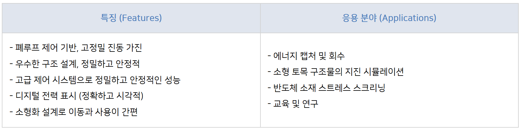 VE ½Ã¸®Áî Mini Shaker´Â ECONÀÌ ÃàÀûÇØ¿Â Áøµ¿ Á¦¾î ±â¼úÀ» ¹ÙÅÁÀ¸·Î °³¹ßµÈ °íÁ¤¹Ð¡¤°í½Å·Ú¼º¡¤±¤´ë¿ª Áøµ¿½ÃÇè ÀåºñÀÔ´Ï´Ù. Á֯ļö ¹üÀ§´Â 2Hz ~ 10,000Hz, °¡Áø·ÂÀº 20N ~ 1,000NÀ̸ç, ¼ÒÇü ºÎǰ ½ºÆ®·¹½º ½ºÅ©¸®´×, ÀüÀÚ ºÎǰ Áøµ¿½ÃÇè, ¼¾¼ °ËÃâ, ¼ÒÇü Åä¸ñ ±¸Á¶¹°ÀÇ Áøµ¿ ½Ã¹Ä·¹À̼Ç, ¿¡³ÊÁö ĸó/ȸ¼ö, ¸ð´Þ °¡Áø ½ÃÇè, ±³À° ¹× °úÇÐ ¿¬±¸ µî¿¡ ³Î¸® »ç¿ëµË´Ï´Ù.