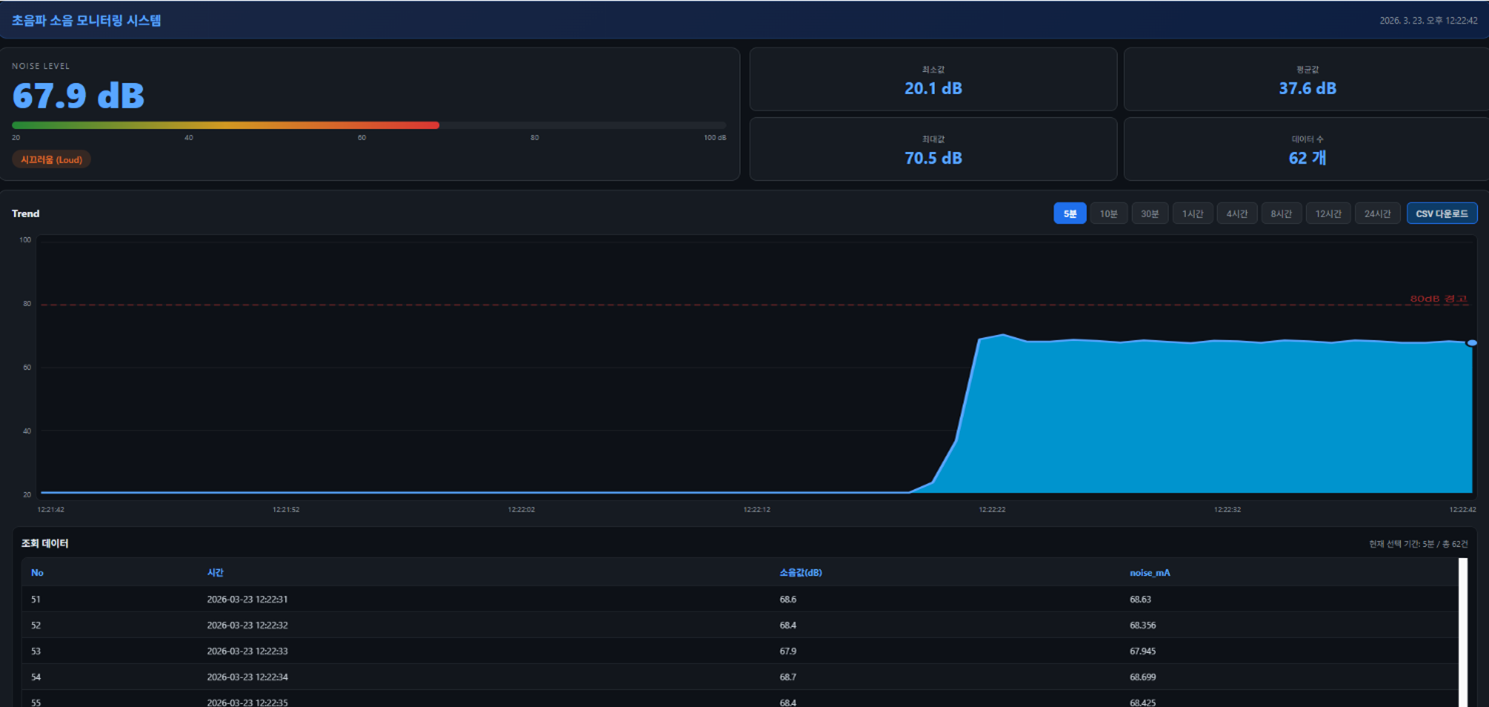 °í°µµ ±¸°£¿¡¼´Â µ¥½Ãº§ °ªÀÌ 80§¼ ÀÓ°è°ªÀ» ÃʰúÇÏ´Â °ÍÀÌ È®ÀεǾîNode-RED¿¡¼ °æº¸ ÀÓ°è°ªÀ» ¼³Á¤ÇßÀ» ¶§ ½ÇÁ¦·Î ¾Ë¶÷ ±¸°£ÀÌ ¸íÈ®È÷ ±¸ºÐµÊÀ» º¸¿©ÁÝ´Ï´Ù.¶ÇÇÑ 4§Ì ±âÁØ¿¡¼ 20.1§¼°¡ Á¤»ó ÃøÁ¤µÊÀ¸·Î½á ¼¾¼ ±âº» µ¿ÀÛ°ú Àü·ù ¡æ µ¥½Ãº§ º¯È¯ ü°è°¡ Á¤È®È÷ ÀÛµ¿ÇÏ´Â °ÍÀ» È®ÀÎÇß½À´Ï´Ù.